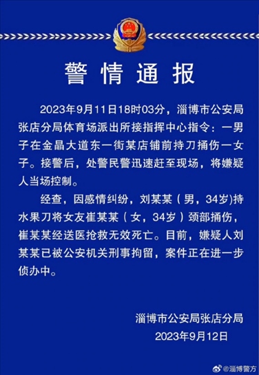 ·淄博警方通報男子捅傷女友:女子經(jīng)搶救無效死亡,嫌疑人被刑拘。