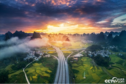 2023年9月10日,廣西百色,日出時分,航拍合那高速靖西市舊州互通立交橋,連綿起伏的群山云霧繚繞,霞光照耀大地。