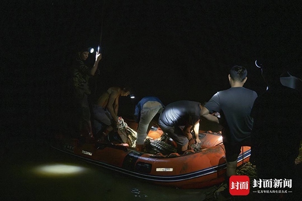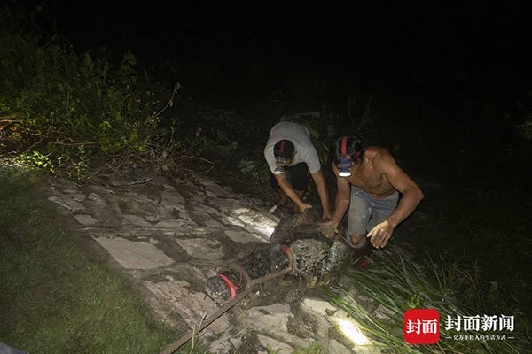9月16日深夜,封面新聞記者從廣東茂名茂南區(qū)“出逃”暹羅鱷抓捕現(xiàn)場獲悉,當(dāng)夜有3條暹羅鱷被專業(yè)人員從養(yǎng)殖場外的水域中抓捕上岸。9月11日,茂南區(qū)一鱷魚養(yǎng)殖場因洪水沖塌圍墻造成部分鱷魚“出逃”,經(jīng)過連續(xù)6天的搜尋,截至16日24時,養(yǎng)殖場中原養(yǎng)殖的71條暹羅鱷已有69條被抓獲,僅剩2條仍在搜尋。
