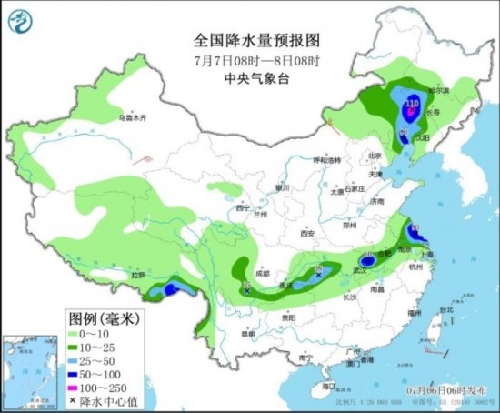 全國降水量預報圖(7月6日08時-7日08時)。圖片來源:中央氣象臺網(wǎng)站