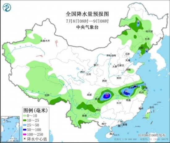 全國降水量預報圖(7月8日08時-9日08時)。圖片來源:中央氣象臺網(wǎng)站