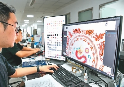 多彩貴州文化數據平臺有限公司的設計師在電腦上做苗繡矢量化提取。