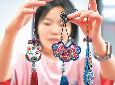 多彩貴州文化產業(yè)投資集團的工作人員在展示苗繡文創(chuàng)產品。
