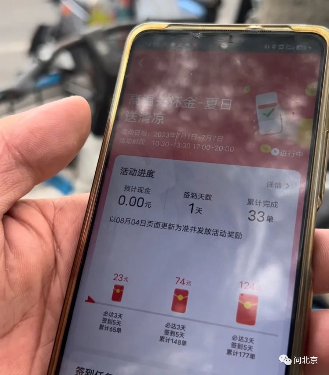 記者點(diǎn)進(jìn)活動(dòng)頁(yè)面看到,必達(dá)3天,簽到5天,累計(jì)65單可獎(jiǎng)勵(lì)23元錢,累計(jì)148單可獎(jiǎng)勵(lì)74元錢,最高獎(jiǎng)勵(lì)是累積177單可獎(jiǎng)勵(lì)124元。但是另一名外賣小哥告訴記者,所謂的高溫關(guān)懷金,只是另一種方式的沖單獎(jiǎng)勵(lì)。