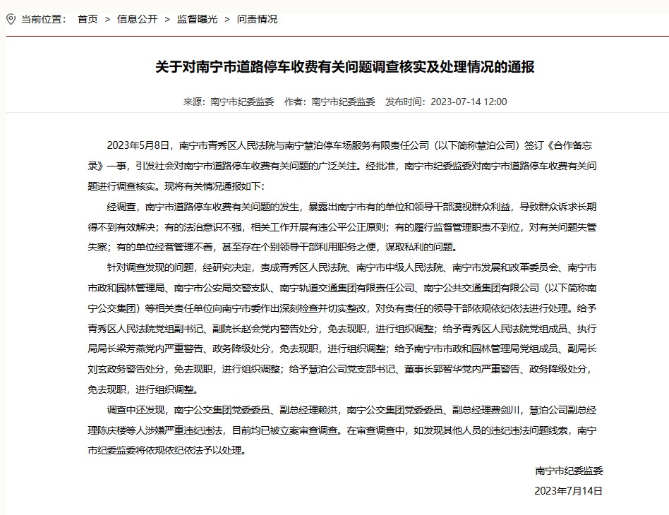 ·南寧通報(bào)道路停車收費(fèi)有關(guān)問題處理情況:4人被免職。