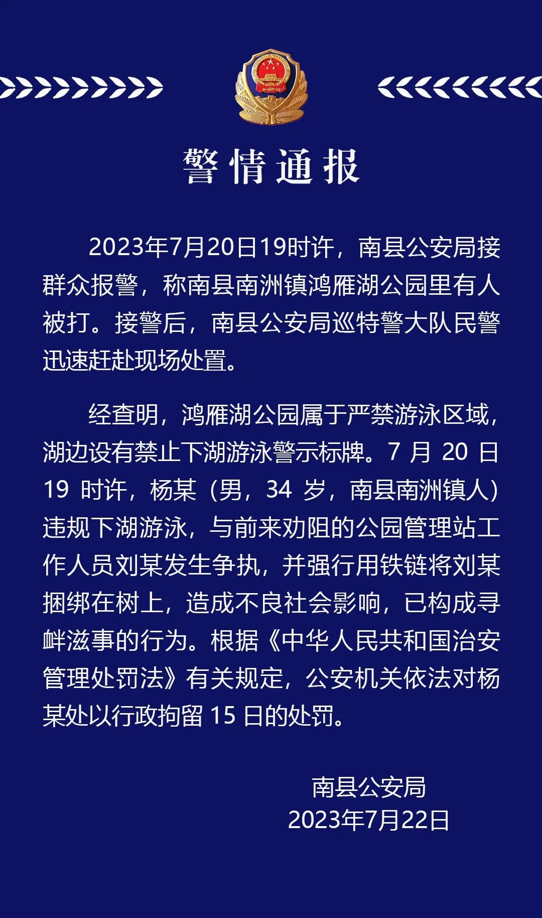 央視網(wǎng)消息:據(jù)湖南益陽市南縣公安局,一男子在湖中游泳遭到巡邏人員制止,竟用鐵鏈將巡邏人員綁到了樹上,調(diào)查結(jié)果公布。