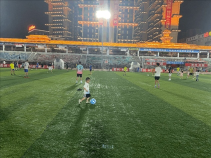 在比賽間隙和結(jié)束后,觀眾席上的孩子們會沖進球場,玩起傳球、盤帶和射門;工作日的晚上,“村超”體育場上,有很多踢球的身影,有中學(xué)足球隊的隊員,有八九歲的小學(xué)生,還有剛剛學(xué)會走路的小朋友。
