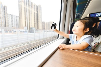 “大運(yùn)號(hào)——成都都市圈旅游主題列車”上,小朋友拿著大熊貓文創(chuàng)產(chǎn)品。胡志強(qiáng)攝(人民圖片)