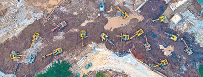 8月4日,救援人員在北京房山區(qū)十渡鎮(zhèn)六渡橋搶修道路,打通交通生命線。本報(bào)記者 張武軍攝