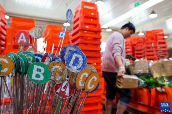 一名工作人員在昆明國際花卉拍賣交易中心內(nèi)對臺車上存放的鮮花進行掃碼(7月13日攝)。新華社記者 陳欣波 攝