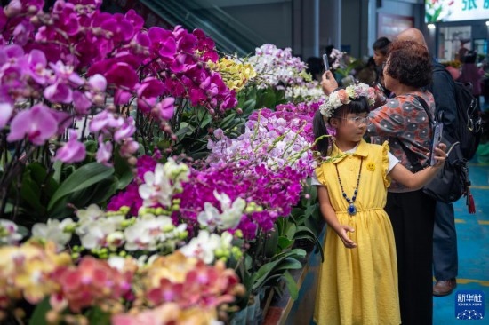 小朋友在昆明斗南花卉市場內(nèi)的鮮花旁自拍(7月13日攝)。新華社記者 陳欣波 攝