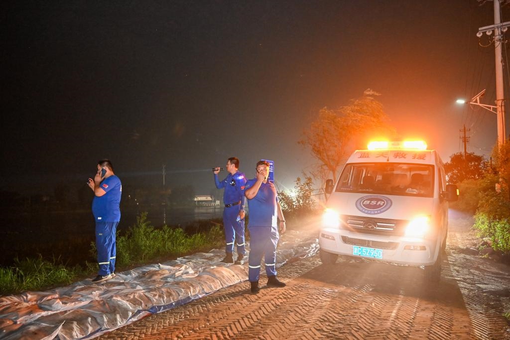 8月4日,在大清河天津靜海段北堤,天津靜海藍(lán)天救援隊隊員夜間巡堤時發(fā)現(xiàn)隱患點后,通過燈光指引和對講機(jī)呼話,與南堤隊員協(xié)同處理。新華社記者 孫凡越 攝
