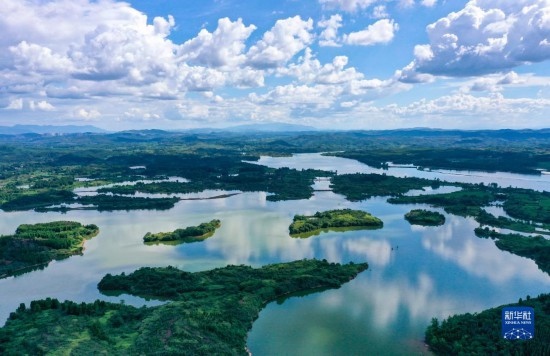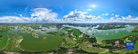 8月6日,湖南桂陽舂陵國(guó)家濕地公園,綠水、濕地、藍(lán)天相映成趣,構(gòu)成一幅秀美的夏日生態(tài)畫卷(無人機(jī)全景照片)。