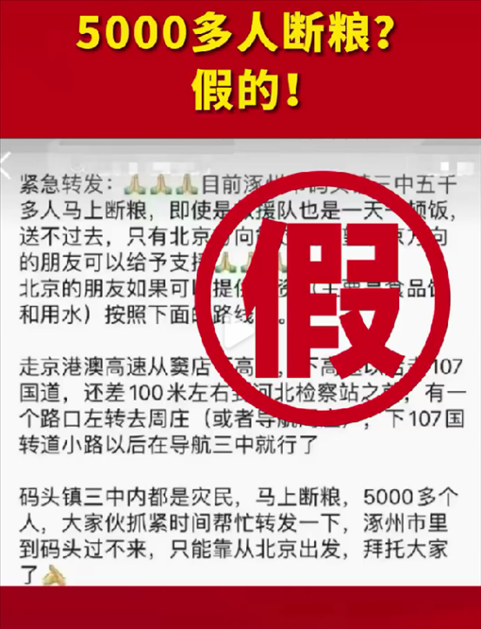 近日,網(wǎng)傳“河北省涿州市碼頭鎮(zhèn)5000多人將斷糧,救援隊也是一天只吃一頓飯,送不過去”消息,引發(fā)了眾多網(wǎng)民關(guān)注。