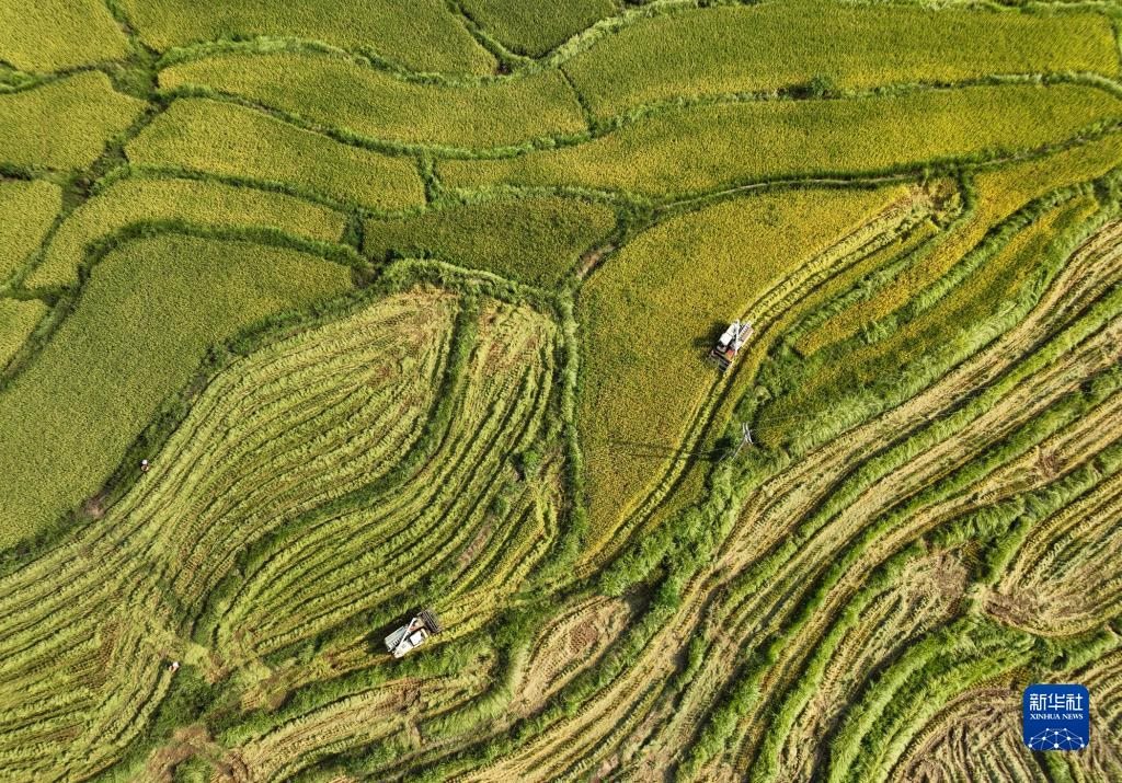 四川省廣安市華鎣市華龍街道東方村的農(nóng)民利用收割機在田間搶收水稻(無人機照片,8月15日攝)。