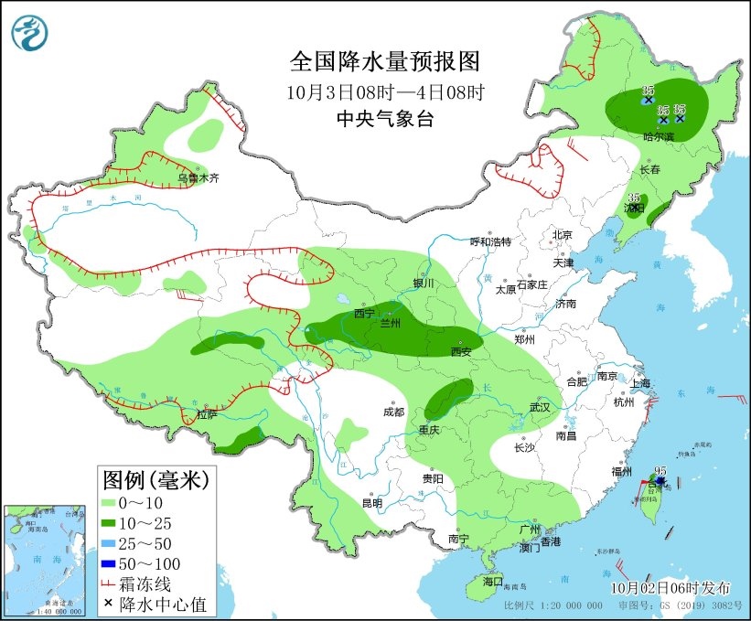 10月3日08時(shí)至4日08時(shí),黑龍江西南部、遼寧東部、西藏東南部、青海東部、甘肅東南部、陜西中南部、重慶北部以及臺(tái)灣島北部等地部分地區(qū)有中到大雨,其中,臺(tái)灣島北部和東部等地部分地區(qū)有暴雨(50~95毫米)。內(nèi)蒙古東南部、西藏北部等地部分地區(qū)有4~6級(jí)風(fēng)。渤海、渤海海峽、黃海大部、東海北部將有6~7級(jí)風(fēng)、陣風(fēng)8級(jí),東海西南部海域風(fēng)力將有7~8級(jí)風(fēng)、陣風(fēng)9級(jí)。臺(tái)灣以東洋面將有7~8級(jí)轉(zhuǎn)9~10級(jí)風(fēng)、陣風(fēng)9級(jí)轉(zhuǎn)11級(jí)(見圖2)。