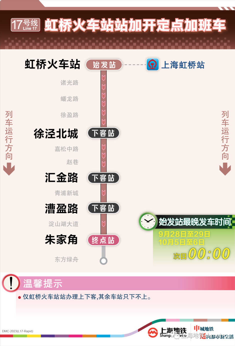 根據(jù)鐵路虹橋站夜間到達(dá)列車開(kāi)行情況,9月28日、9月29日、10月5日、10月6日,鐵路在原夜間圖定計(jì)劃的基礎(chǔ)上增加了開(kāi)行班次。為應(yīng)對(duì)鐵路臨時(shí)加開(kāi),做好虹橋火車站夜間列車集中到達(dá)大客流疏散工作,虹橋樞紐相關(guān)的地鐵2、10、17號(hào)線在既定延時(shí)或加開(kāi)方案的基礎(chǔ)上進(jìn)一步增開(kāi)定點(diǎn)加班車。其中,9月28日至29日、10月5日至6日夜間,虹橋火車站定點(diǎn)加班車最晚發(fā)車時(shí)刻為:2號(hào)線至次日2:00、10號(hào)線至次日0:30、17號(hào)線至次日0:00。同時(shí),9月30日至10月4日,2號(hào)線和10號(hào)線虹橋火車站定點(diǎn)加班車發(fā)車時(shí)刻推遲至次日0:20。