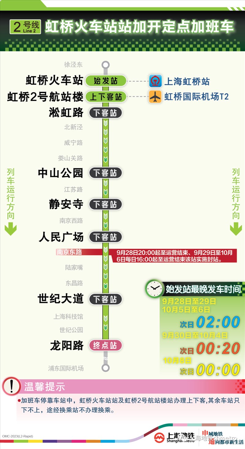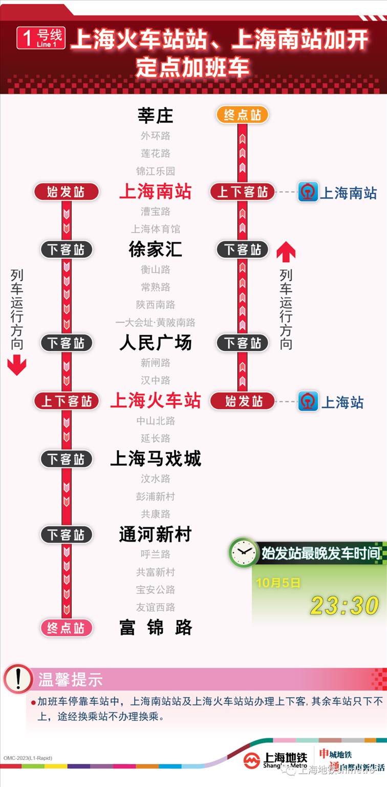 此外為做好節(jié)假日返程期間上?;疖囌?、虹橋火車站、上海南站的夜間客流疏散工作,10月5日,地鐵1號(hào)線在圖定基礎(chǔ)上實(shí)施定點(diǎn)加開(kāi)方案,加開(kāi)末班車發(fā)車時(shí)間至23:30;另10月8日地鐵2號(hào)線增加定點(diǎn)加班車班次,加開(kāi)末班車發(fā)車時(shí)間至次日0:00。