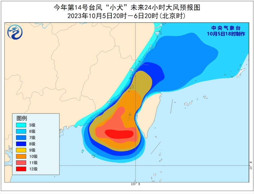 大風(fēng)預(yù)報(bào):5日20時(shí)至6日20時(shí),東海大部及釣魚(yú)島附近海域、巴士海峽西北部、臺(tái)灣海峽、南海東北部以及浙江沿海、福建沿海、廣東東部沿海、臺(tái)灣島北部沿海將有6-8級(jí)、陣風(fēng)9-10級(jí)的大風(fēng),其中巴士海峽西北部、臺(tái)灣海峽、南海東北部等地部分海域?qū)⒂?-10級(jí)、陣風(fēng)11-13級(jí)的大風(fēng),“小犬”中心經(jīng)過(guò)的附近海面風(fēng)力有11-13級(jí),陣風(fēng)14-15級(jí)。