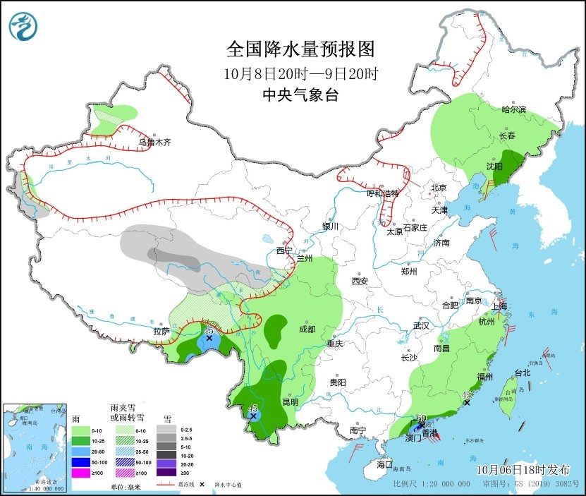 10月6日20時至7日20時,新疆南疆盆地西部沿山地區(qū)、青海南部、西藏東部等地有小到中雪或雨夾雪;西藏東南部、四川盆地東部和南部、云南中東部、福建中南部、廣東東部、海南島南部、臺灣島西部等地部分地區(qū)有中到大雨,其中,廣東東部和福建南部沿海等地局部地區(qū)有暴雨(50~65毫米)。內(nèi)蒙古中東部、遼東半島、浙江東部沿海等地部分地區(qū)有4~6級風(fēng),西藏中部部分地區(qū)有6~7級風(fēng)。臺灣海峽將有6~7級、陣風(fēng)8級的東北風(fēng),南海東北部海域?qū)⒂?~9級、陣風(fēng)10級的偏北風(fēng)(見圖1)。