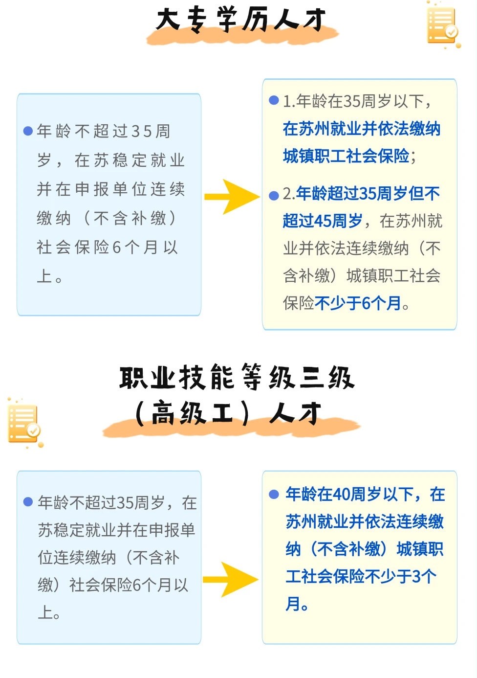 2.符合蘇州市引進技能人才緊缺(工種)目錄的職業(yè)技能等級三級(高級工)社保繳費年限、年齡放寬:年齡條件從35周歲放寬至40周歲,連續(xù)繳納社保時間從6個月縮減為3個月。
