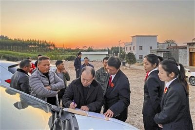 考慮到目前農(nóng)村建房施工矛盾糾紛普遍發(fā)生,為達到“審理一案,教育一片”的普法效果,近日,廣西壯族自治區(qū)象州縣人民法院石龍人民法庭干警來到象州縣馬坪鎮(zhèn)新圩村,巡回審理一起農(nóng)村建房施工合同糾紛案,并邀請當?shù)卮迕衽月犕彙?/p>