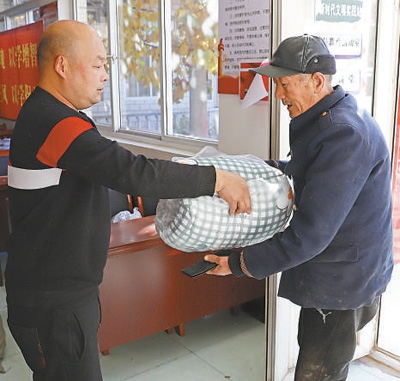 上午10時(shí),走進(jìn)碼頭村黨群服務(wù)中心,正碰上73歲老人杜金亭騎著電動(dòng)三輪車,載著老伴來領(lǐng)新棉被。為保障困難群眾冬季取暖,涿州市民政局為全市殘疾人、“六類人群”免費(fèi)發(fā)放過冬棉被。杜金亭的老伴肢體殘疾,是低保戶?!靶路颗渖闲旅薇?,這個(gè)冬天不愁了!”取上新棉被,杜金亭邀請(qǐng)記者去新家看一看。