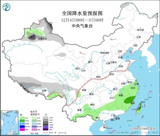 12月3日08時至4日08時,新疆北部、內蒙古東北部、黑龍江西北部、西藏西南部和東部、川西高原等地部分地區(qū)有小到中雪或雨夾雪,其中,新疆北疆北部等地部分地區(qū)有大到暴雪,局地大暴雪或特大暴雪(30~35毫米)。江南、西南地區(qū)東部和南部、華南北部和西部、臺灣島等地部分地區(qū)有小雨,其中,湖南南部、江西中南部、福建中部、廣西東北部、臺灣島中北部等地部分地區(qū)有中雨。內蒙古中西部等地部分地區(qū)有4~6級風。