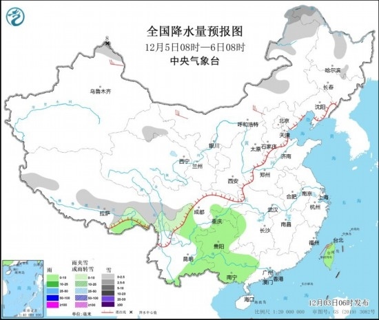 12月5日08時至6日08時,新疆北疆北部、內蒙古中東部、黑龍江西北部、西藏東部和北部、甘肅河西、川西高原等地部分地區(qū)有小雪或雨夾雪,其中,內蒙古東北部、黑龍江西北部、新疆北疆北部等地部分地區(qū)有中到大雪(5~8毫米)。西南地區(qū)東部、云南東部、廣西大部、臺灣島等地部分地區(qū)有小雨。新疆北部、內蒙古中西部等地部分地區(qū)有4~6級風。