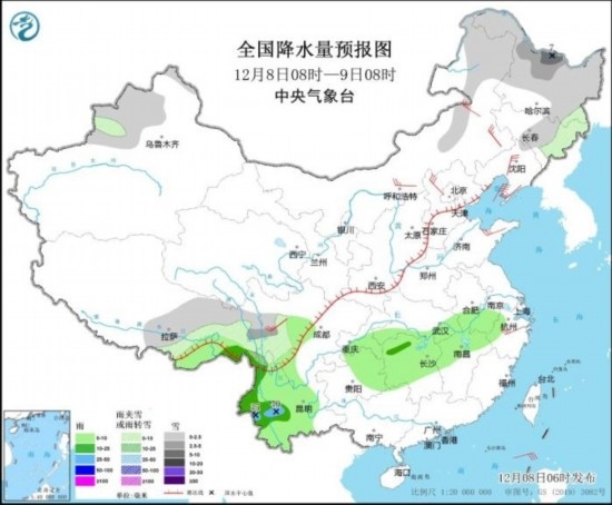 全國降水量預(yù)報(bào)圖(12月8日08時(shí)-9日08時(shí))