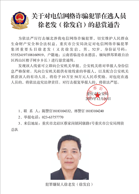 據(jù)了解,今年11月,我公安機(jī)關(guān)對以明學(xué)昌為首的家族犯罪集團(tuán)重要頭目進(jìn)行公開懸賞通緝。在緬甸各方的大力配合下,首犯明學(xué)昌畏罪自殺,明國平、明菊蘭、明珍珍3人被緝拿歸案,公安機(jī)關(guān)正徹查其犯罪事實,將依法予以嚴(yán)懲。與此同時,遼寧、福建、重慶等地公安機(jī)關(guān)在偵查中發(fā)現(xiàn),以白所成、魏懷仁、劉正祥為首的3個家族犯罪集團(tuán)和以徐老發(fā)為首的犯罪集團(tuán),長期實施針對中國公民的電信網(wǎng)絡(luò)詐騙犯罪活動,詐騙數(shù)額巨大。在公安機(jī)關(guān)嚴(yán)打高壓態(tài)勢下,仍不收斂、不收手,同時涉嫌故意殺人、故意傷害、非法拘禁等多種嚴(yán)重暴力犯罪,犯罪事實清楚,證據(jù)確鑿充分。