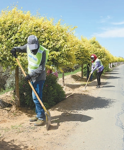 磴口縣防沙治沙局森林管護(hù)大隊工作人員在為堤防公路兩側(cè)的林帶除草。張 棖 邢 皓攝影報道