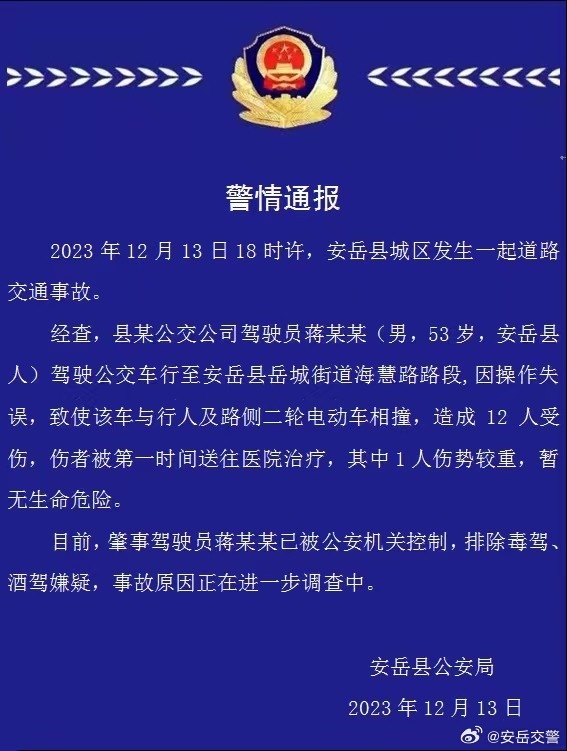 ·四川安岳一公交車(chē)中學(xué)門(mén)口撞倒多名學(xué)生,警方通報(bào):12人受傷。