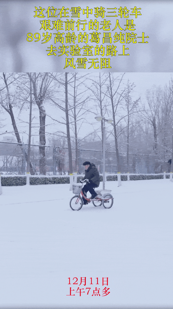 近日,早上7點(diǎn)多,北京降雪后,在北京科技大學(xué)的校園內(nèi),拍到感人一幕。茫茫白雪中,一位老人吃力地蹬著三輪車(chē)緩緩地前進(jìn),風(fēng)雪無(wú)阻。老人是89歲的葛昌純?cè)菏?,這天早晨,他正騎車(chē)前往實(shí)驗(yàn)室,而騎著三輪車(chē)去實(shí)驗(yàn)室,是葛老幾十年如一日的堅(jiān)持。葛昌純?cè)菏渴侵瞬牧稀⒎勰┮苯鹨约跋冗M(jìn)陶瓷專家,是我國(guó)“核工業(yè)功勛”人物,為“兩彈一星”事業(yè)作出了重要貢獻(xiàn)。