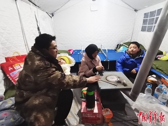 12月19日晚,甘肅省積石山縣大河家鎮(zhèn)一處安置點,30歲的馬繼云一家在安置點帳篷里烤火爐。當天他們收到了政府和愛心企業(yè)提供的生活物資,把一家人的生活安頓了下來。中青報·中青網(wǎng)記者 馬富春/攝