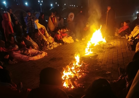 該校教師喬海龍在細節(jié)中看出了孩子們的恐慌,“門廳的玻璃被擠破了,很多學(xué)生都只穿著單衣拖鞋”。零下十幾攝氏度的寒風(fēng)中,孩子們?nèi)齼蓛杀ё饕粓F,老師們站成一圈,圍住學(xué)生。