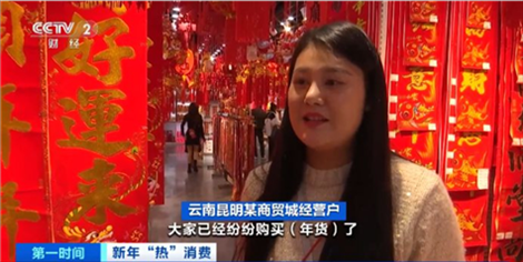 云南昆明某商貿(mào)城經(jīng)營戶:從上個月開始,人們就已經(jīng)開始購買年貨。燈籠、福字、對聯(lián),還有窗花、擺件都是最熱銷的產(chǎn)品。采購高峰期從這個月開始,批發(fā)商已經(jīng)開始補貨,一直會持續(xù)到臘月二十八左右。