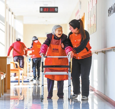 江西宜春市袁山社區(qū)養(yǎng)老服務(wù)中心工作人員在陪老人散步。 周 亮攝(人民視覺(jué))