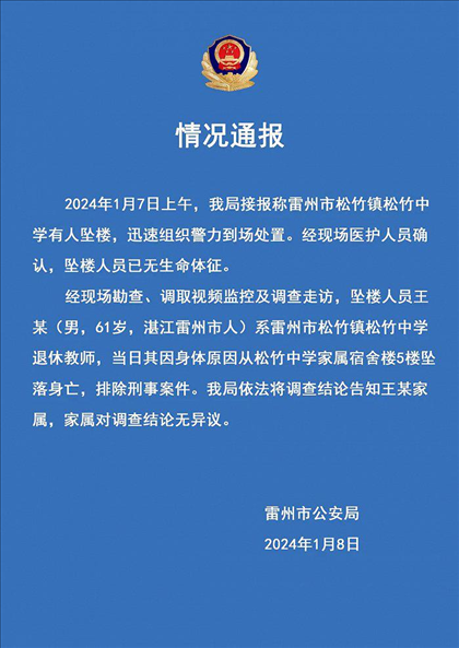·廣東湛江一中學(xué)老師墜樓,警方通報(bào):排除刑事案件。