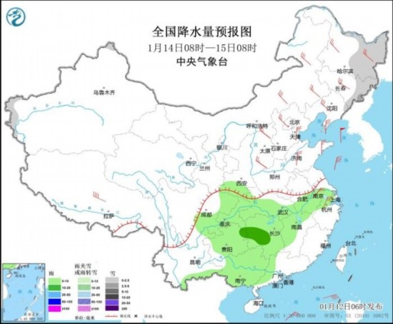 全國降水量預(yù)報圖(1月14日08時-15日08時)