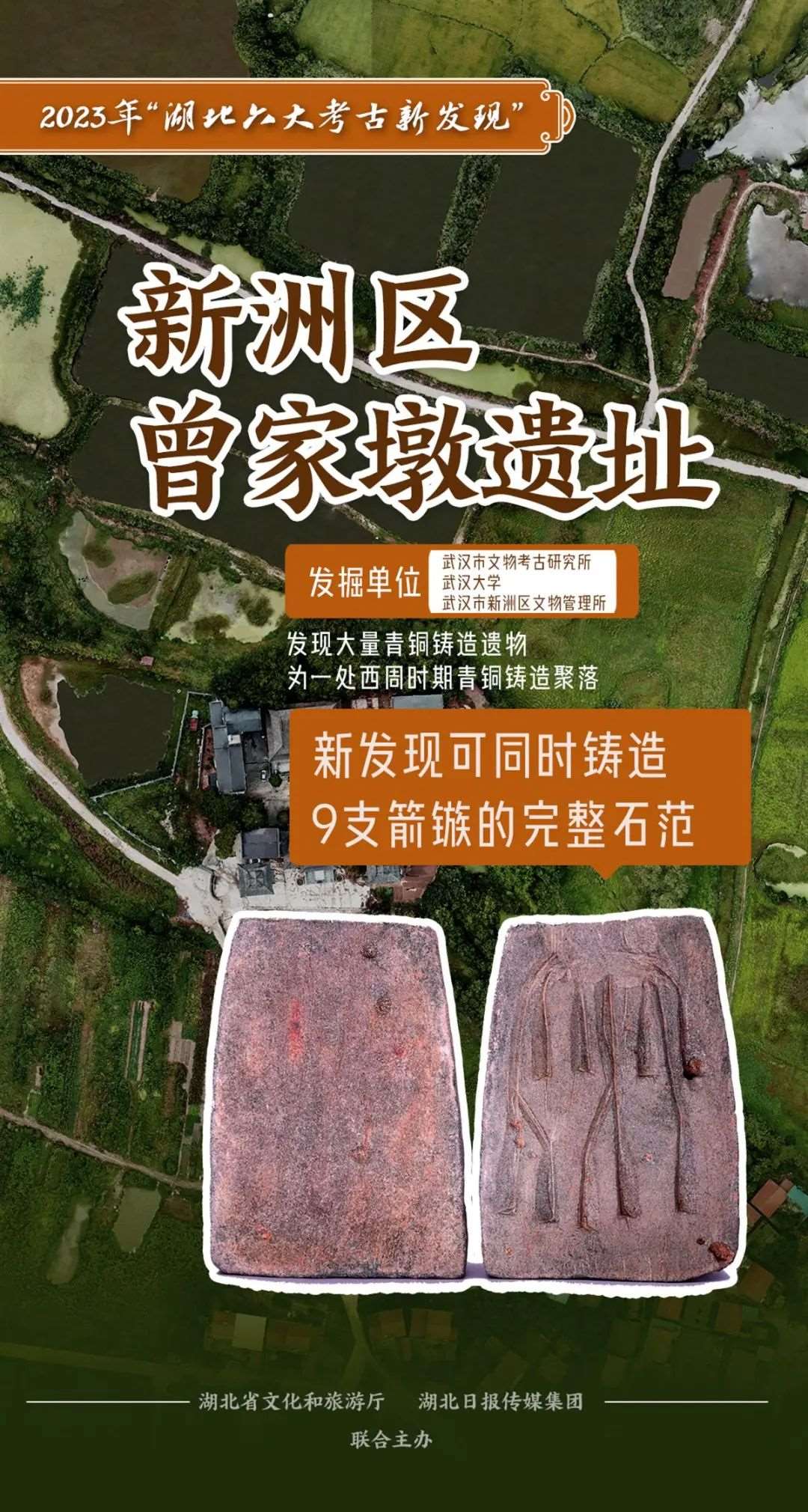 繼武漢黃陂盤龍城遺址小嘴遺址點、郭元咀遺址發(fā)現(xiàn)商代鑄銅遺存后,考古工作者在新洲曾家墩遺址新發(fā)現(xiàn)西周時期青銅鑄造遺存。遺址出土一塊用于鑄造青銅箭鏃的石范(即鑄造青銅器的石質模具),保存完好,其完整程度在此前湖北地區(qū)考古中未曾發(fā)現(xiàn)。這塊石范可同時鑄造9支青銅箭鏃,具有相當高的工藝水平。