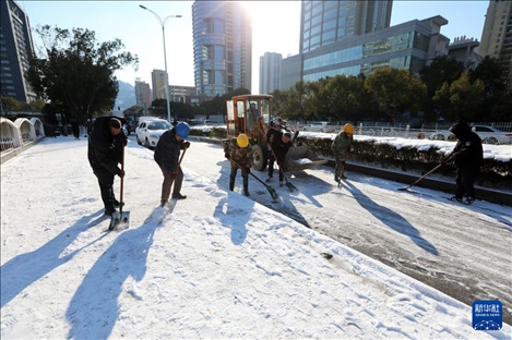 1月23日,在浙江省溫嶺市,人們?cè)谇宄访姹?。近日,受寒潮天氣影響,我?guó)多地迎來降溫降雪天氣,各地積極組織相關(guān)部門開展抗凝除雪工作,保安全保暢通。新華社發(fā)(周學(xué)軍攝)
