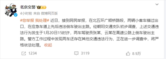 ·網(wǎng)民舉報(bào)“北五環(huán)廣順橋路段兩車在高速公路上倒車”,北京交警通報(bào)。