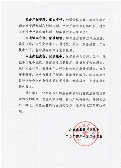 央視網(wǎng)消息:據(jù)北京市餐飲行業(yè)協(xié)會公眾號消息,據(jù)為進一步規(guī)范北京年夜飯市場秩序,營造首都良好節(jié)日餐飲消費環(huán)境,保障消費者合法權益,讓廣大市民體驗到優(yōu)質(zhì)的年夜飯服務。同時,更好地杜絕虛假價格、價質(zhì)不符、不合理定價、不合規(guī)收費等不規(guī)范行為,北京市餐飲行業(yè)協(xié)會特發(fā)布如下倡議: