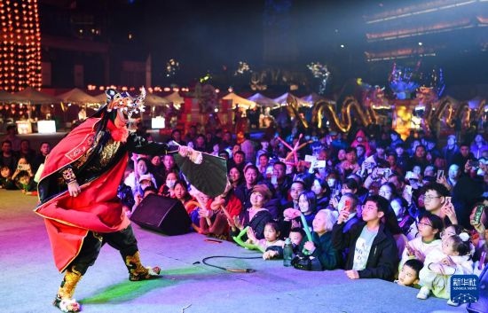 2月14日,市民和游客在重慶南濱路鐘樓廣場(chǎng)觀看川劇表演。