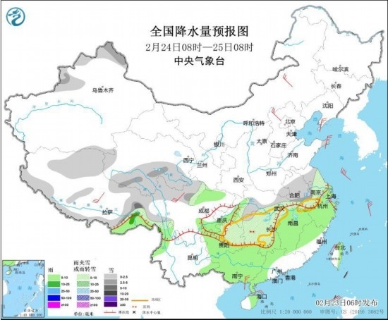 全國降水量預(yù)報圖(2月24日8時-25日8時)
