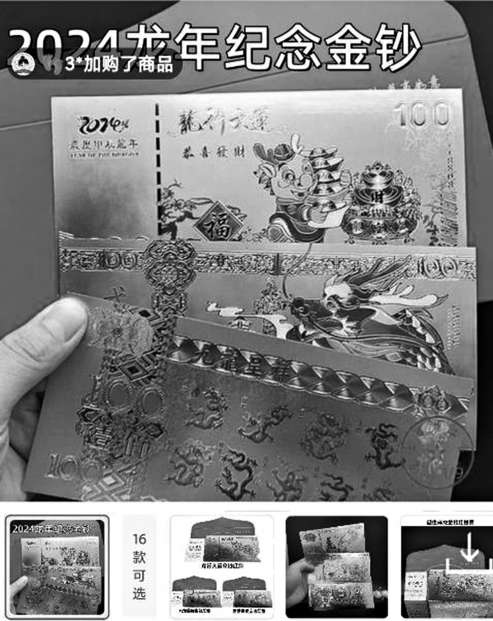一些直播間里,正在兜售“足金”“足銀”類的龍年紀(jì)念鈔。這些紀(jì)念鈔,乍一看外形與錢幣相差不大,在金銀材質(zhì)的襯托下顯得很高大上。記者發(fā)現(xiàn),這些“紀(jì)念鈔”售價(jià)通常比券面所標(biāo)數(shù)字低上一兩元,例如標(biāo)著100的,多售價(jià)98元、99元。