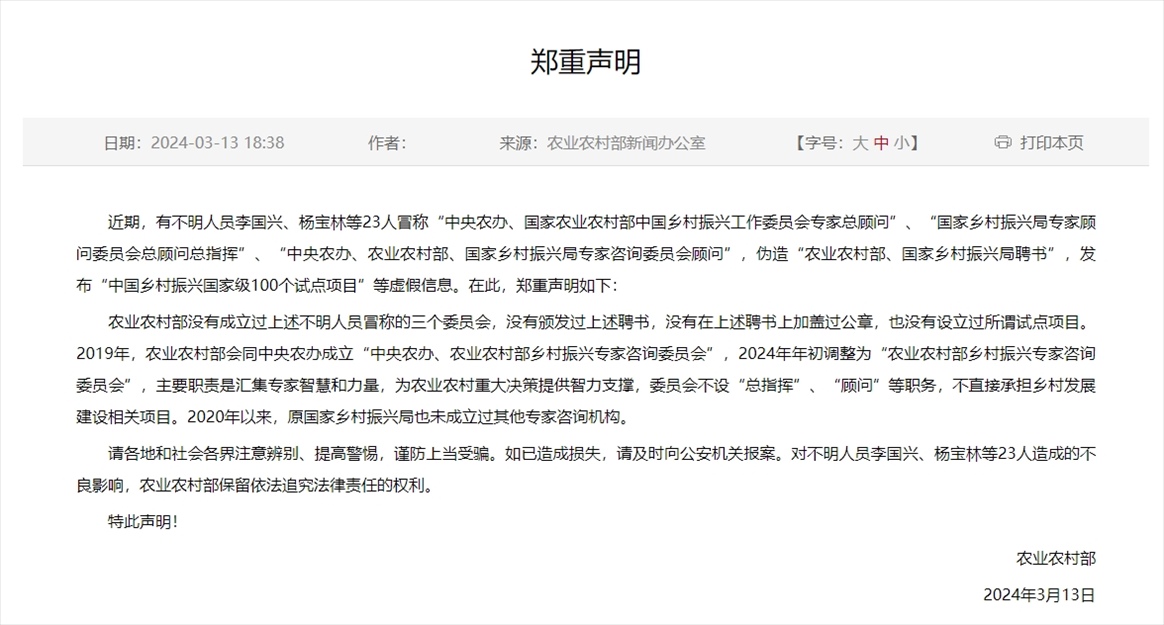 ·農(nóng)業(yè)農(nóng)村部鄭重聲明:沒(méi)有成立過(guò)不明人員冒稱(chēng)的“中央農(nóng)辦、國(guó)家農(nóng)業(yè)農(nóng)村部中國(guó)鄉(xiāng)村振興工作委員會(huì)專(zhuān)家總顧問(wèn)”、“國(guó)家鄉(xiāng)村振興局專(zhuān)家顧問(wèn)委員會(huì)總顧問(wèn)總指揮”、“中央農(nóng)辦、農(nóng)業(yè)農(nóng)村部、國(guó)家鄉(xiāng)村振興局專(zhuān)家咨詢(xún)委員會(huì)顧問(wèn)”三個(gè)委員會(huì),沒(méi)有頒發(fā)過(guò)上述聘書(shū),沒(méi)有在上述聘書(shū)上加蓋過(guò)公章,也沒(méi)有設(shè)立過(guò)所謂試點(diǎn)項(xiàng)目。