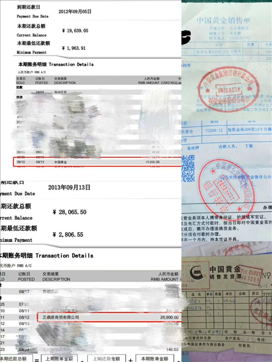 王鑫民:09年時候,他們跟順義那邊就有一個中國黃金店,就賣投資的黃金。我們想說買點,將來自個老了以后能有一保證。他說,你要能寄存到這兒,還能給你點小禮品,我們想挺好的,你擱家多不安全,這么貴重的東西,我們就擱他那了,他給我們開單子。后來,順義這店搬到雙井去了,這是中國黃金的,而且商場更大,誰不都得放心。我們想跟他們也熟了,每年有點兒錢就買一點兒,還安全,還有點小獎品,左一回買右一回買的,他店員都認得我們了,挺熟的。他突然給我們打電話說:這出事了,你們趕緊過來。