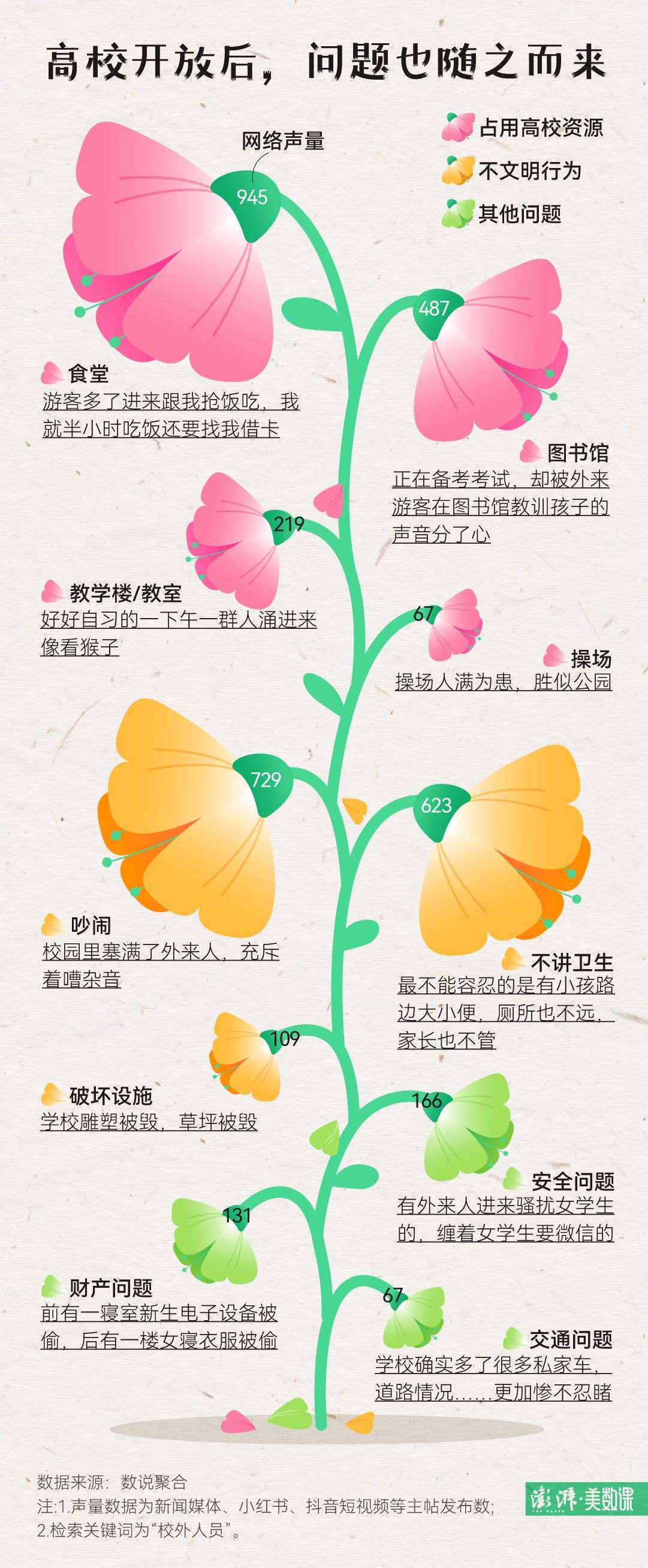 不僅是武大學(xué)生,在社交媒體上,不少高校學(xué)生近期都表示遇到了類似的煩惱。澎湃新聞在數(shù)說聚合平臺上檢索了近一個月來,包括小紅書、抖音等在內(nèi)平臺上提到“校外人員”的帖子后發(fā)現(xiàn),校園開放后學(xué)生們最大的困擾,就是游客太多,導(dǎo)致食堂、圖書館等校園資源被侵占。